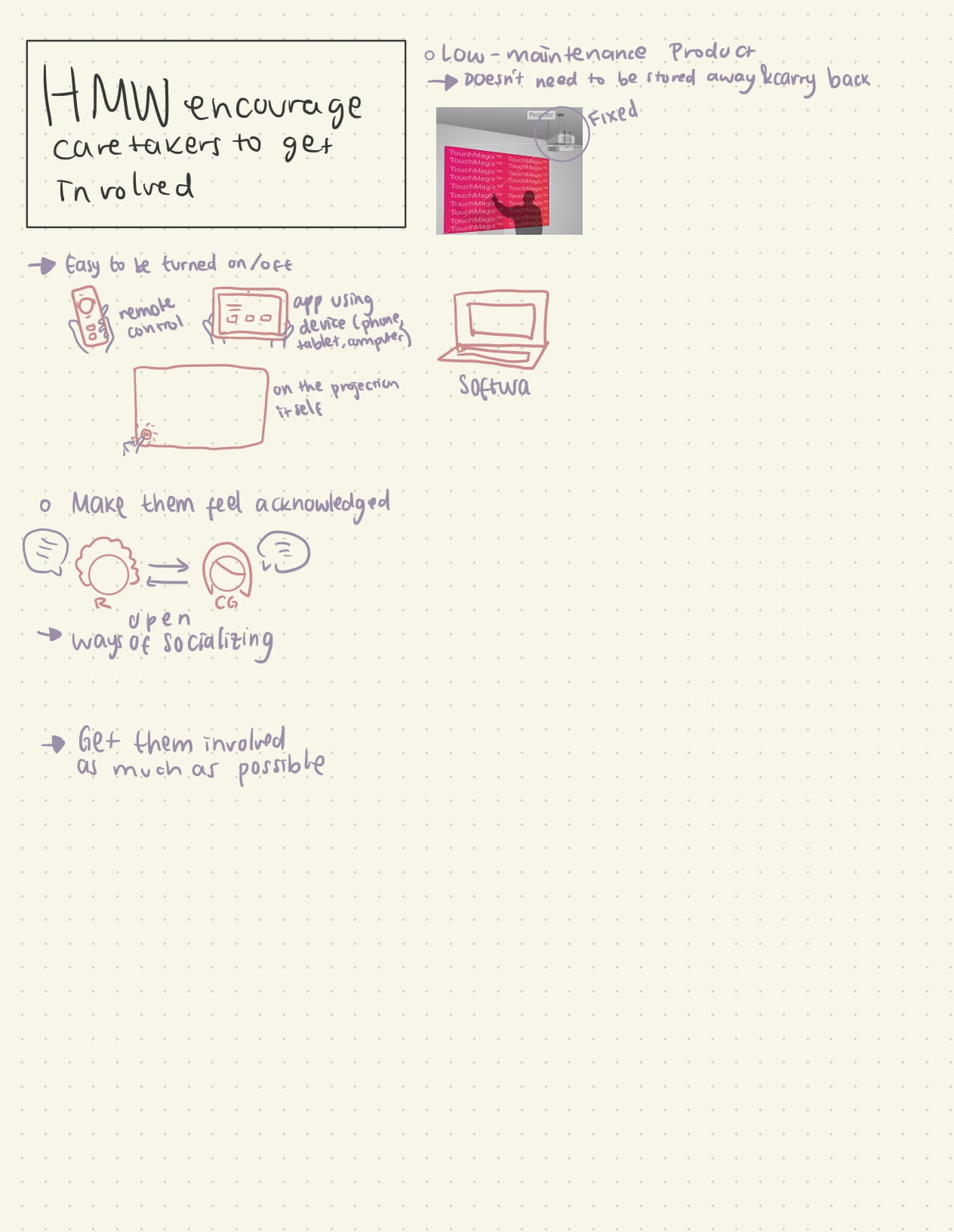 The caregivers gave a positive feedback to the interfaces and thought this would be a product that they don't need to assist for the residents, as the residents will interact with it on their own. The feedback remains the same, about the shadow that needs to go because it would cause problems with the residents.