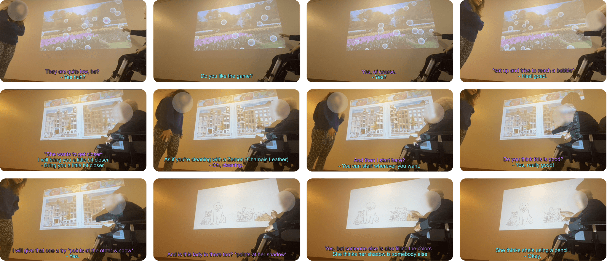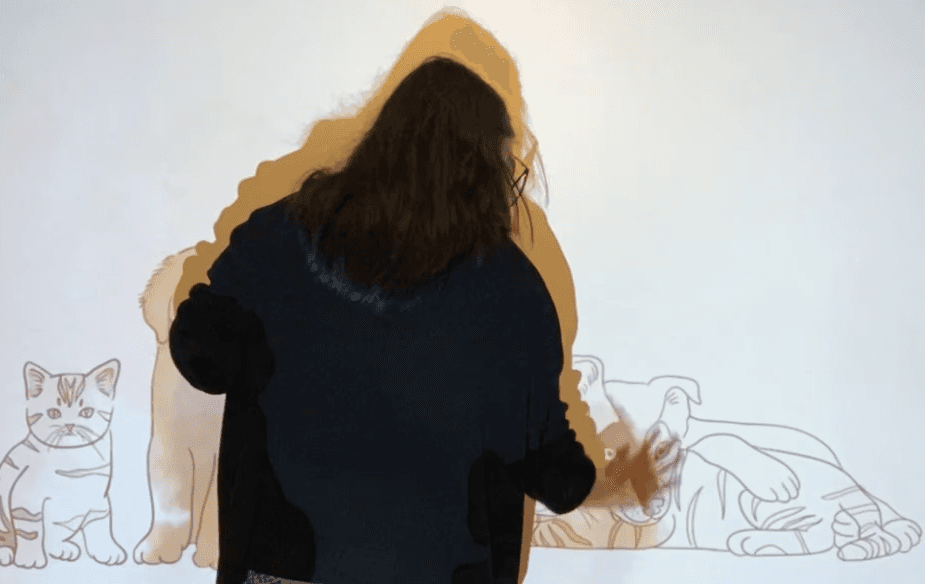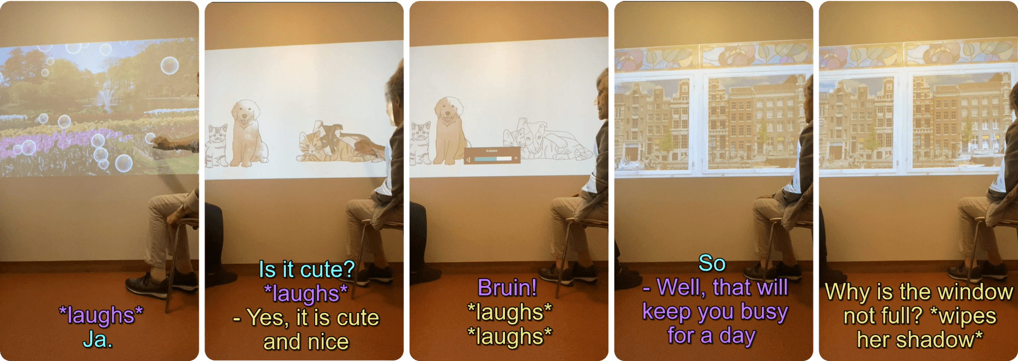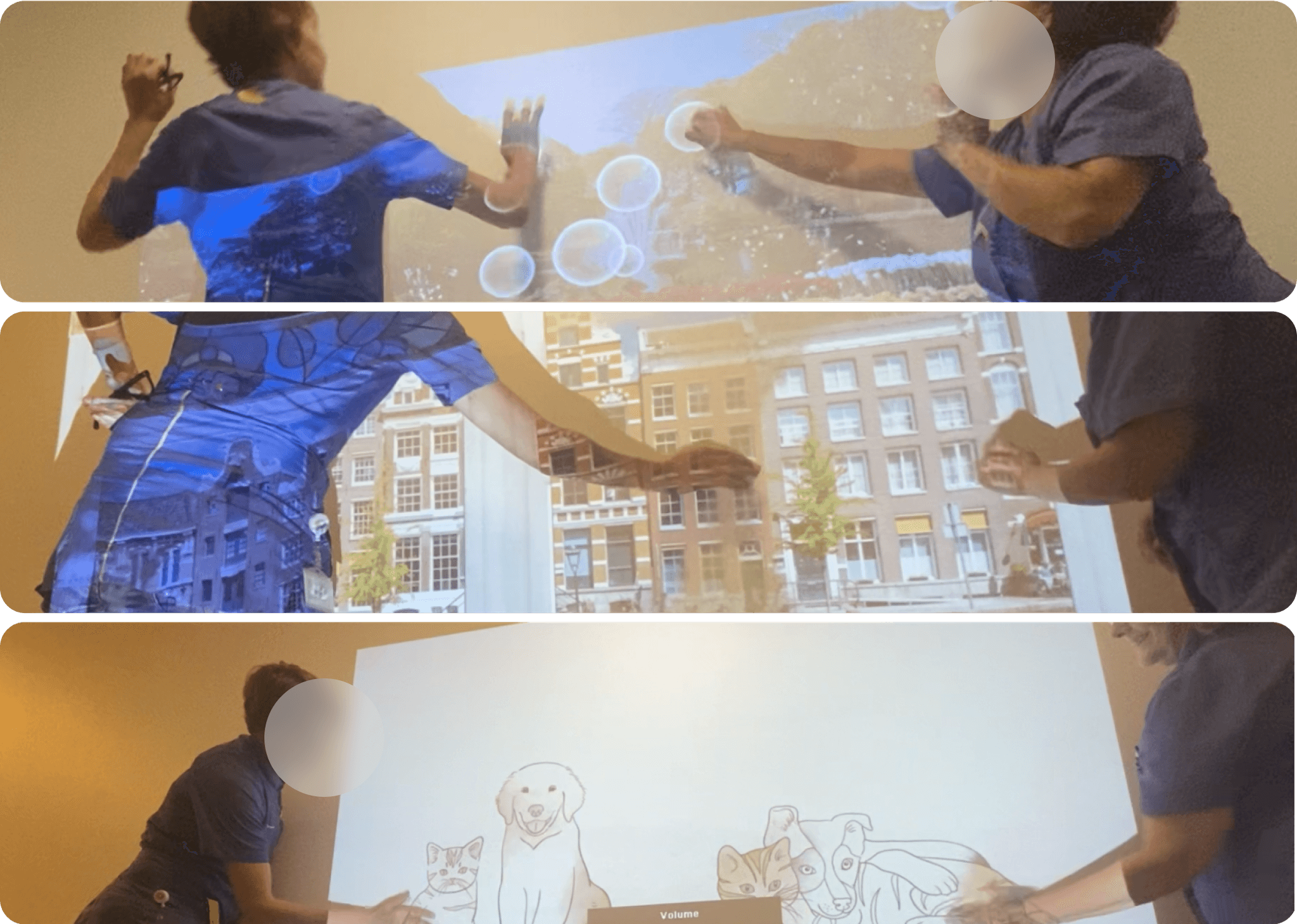 With this interface, residents can "color" the walls using just their hands, accompanied by playful sounds like a "meow" and a small “woof”. This allows them to reminisce about their pets or joyful moments from their youth, fostering emotional connection.