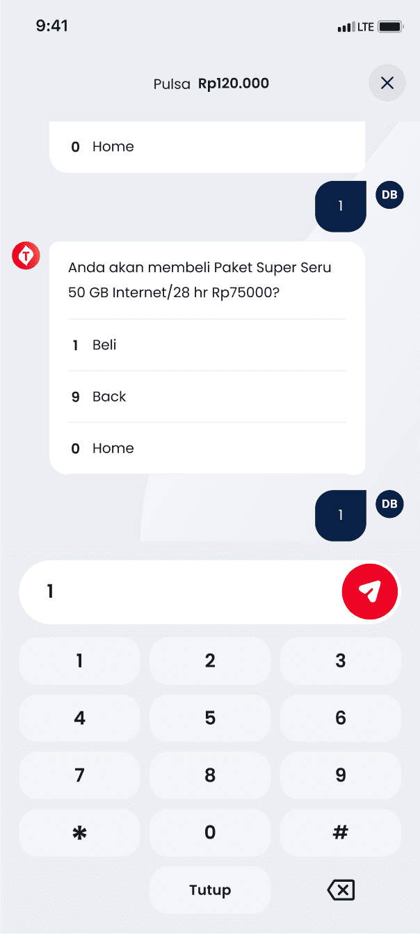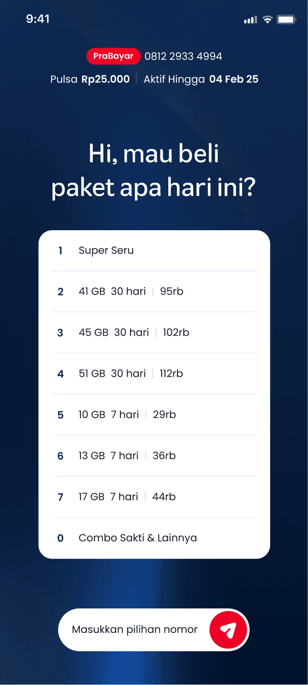 Learning curve of *888# users is being stimulated in this part. But, the dashboard helps users find and access essential features: Buy Internet Package, Buy Credit, Check Remaining Quota. This also serves as a bridge from the MyTelkomsel Basic app to the main MyTelkomsel app, providing easy access to features that are only available in the main app.